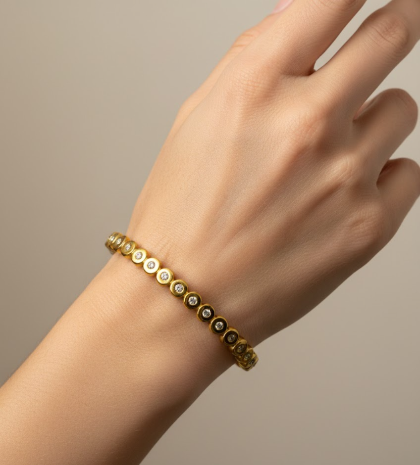 Perfect for both casual and formal occasions, the Aura Circle Bangle is more than just an accessory; it’s a statement of style and grace. Its versatile design allows it to be worn solo for a minimalist look or stacked with other bangles for a trendy layered effect.