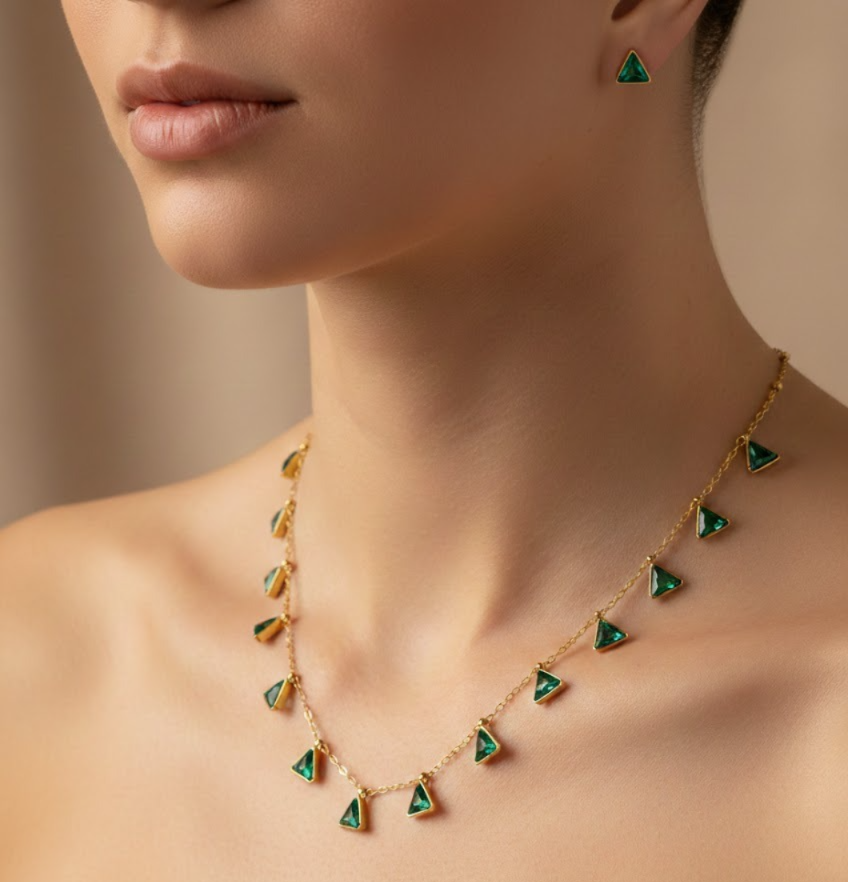 Whether you're dressing up for a special occasion or adding a touch of glamour to your everyday wear, the Emerald Green Triangular Necklace is a must-have. Embrace the vibrant hue and striking design that make this necklace a standout piece in your jewelry collection.